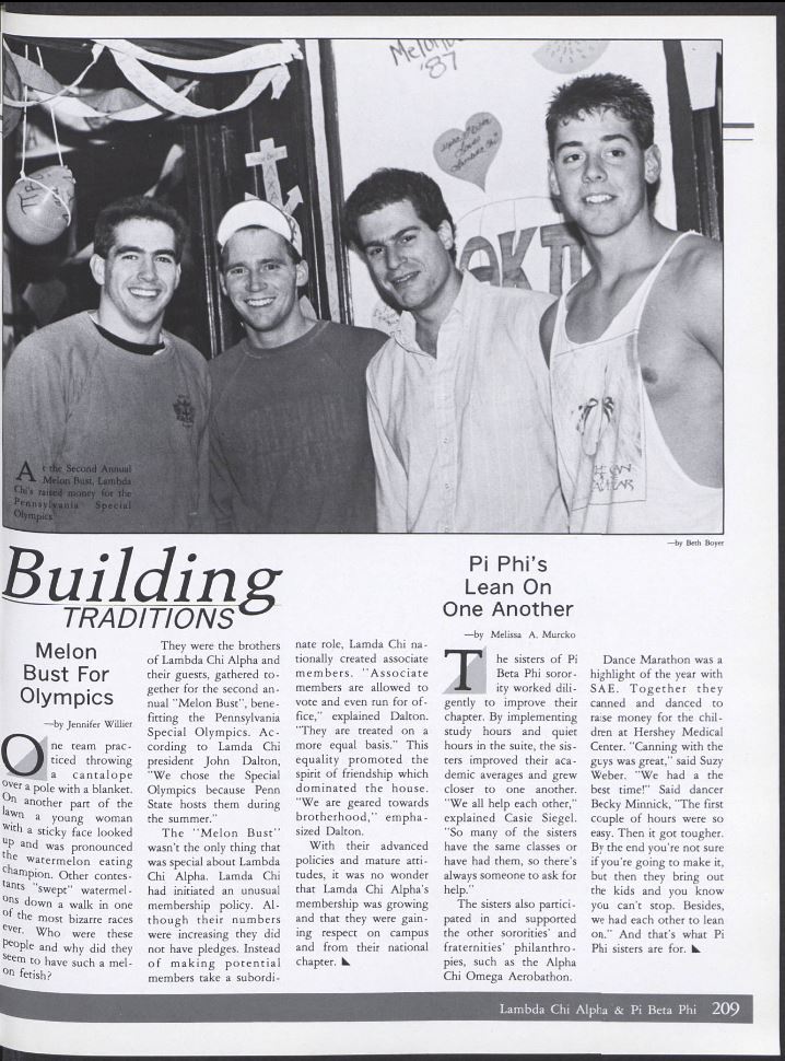Source Courtesy of La Vie Check out this blast from the past, all the way back to 1988! Lambda Chi Alpha is featured in Penn State’s Yearbook, La Vie, for the 2nd Annual Melon Bust! Do you remember the event, were you there, did you participate, do you recognize these fellas in the photo? We […]